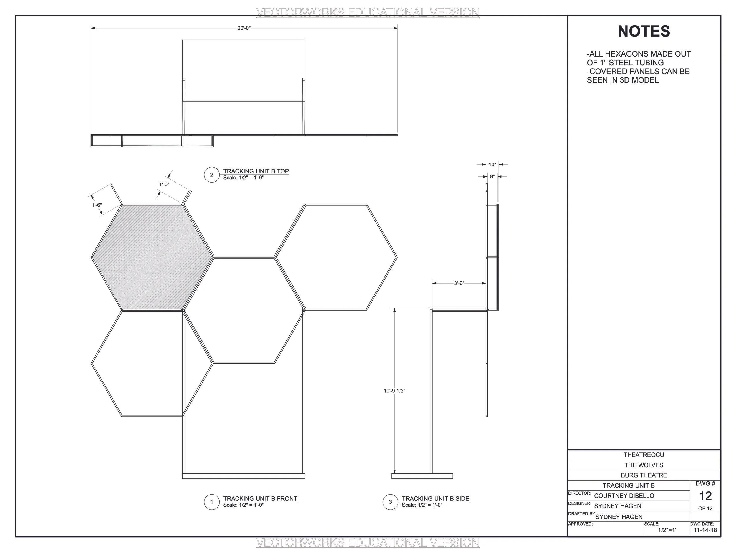 Sarah DeLappe’s The Wolves showcases the dynamic and complicated relationships between nine teenage girls on an indoor soccer team. Traditionally, The Wolves is performed on an empty field covered in AstroTurf, with no other scenery whatsoever. I knew going into this project that I wanted to get creative with the concept of an empty soccer field, and luckily the director agreed with me. We chose to go with some kind of abstraction of a soccer ball and field- the ball as some kind of structure that suggested the Plexiglass wall of an indoor soccer field, and the field as the floor of the stage. We decided that we wanted the scenery to grow with the team and become more unified and corporeal as the girls came together as a team. We were drawn early on to the shape of a soccer ball, and the concept of some kind of hexagonal structure that seemed to grow behind the cast. I was introduced to geodesic domes, which are round structures that are formed from a repeating pattern of angled polygons such as triangles or hexagons. Using this idea, we developed a series of units that would track across the stage between acts, adding to the overall structure until it was a unified pattern by the end of the show. The decision was made to have the structure grow in stages (one per scene) in order to showcase the growing bonds between the girls that strengthens in each scene. We also decided to utilize projections, and so we chose nine separate hexagons to cover and project on- one for each member of the team. When the pieces were all in place, we had a wall of hexagons that was dynamic and unique, yet unified and complete- just like the Wolves are by the end of the show.